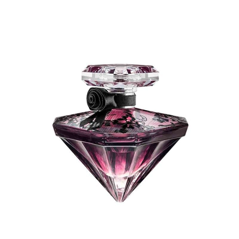 تم تزيين لا نوي تريزور الأيقوني من لانكوم بحجاب من الدانتيل المصمم على طراز عالي الجودة. تم تصميم وإنتاج هذاه الماسة الجديدة حصريًا لشركة لانكوم.